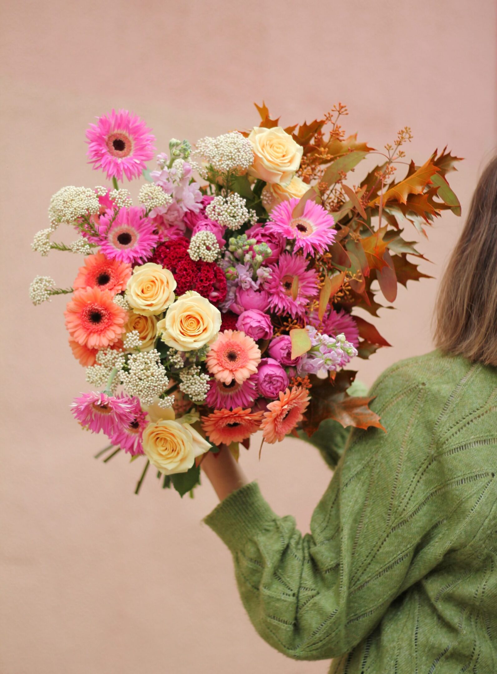 Букет с герберами, пионовидными розами, листьями дуба и озотамнусом