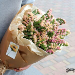 Букет с герберами, пионовидными розами, листьями дуба и озотамнусом