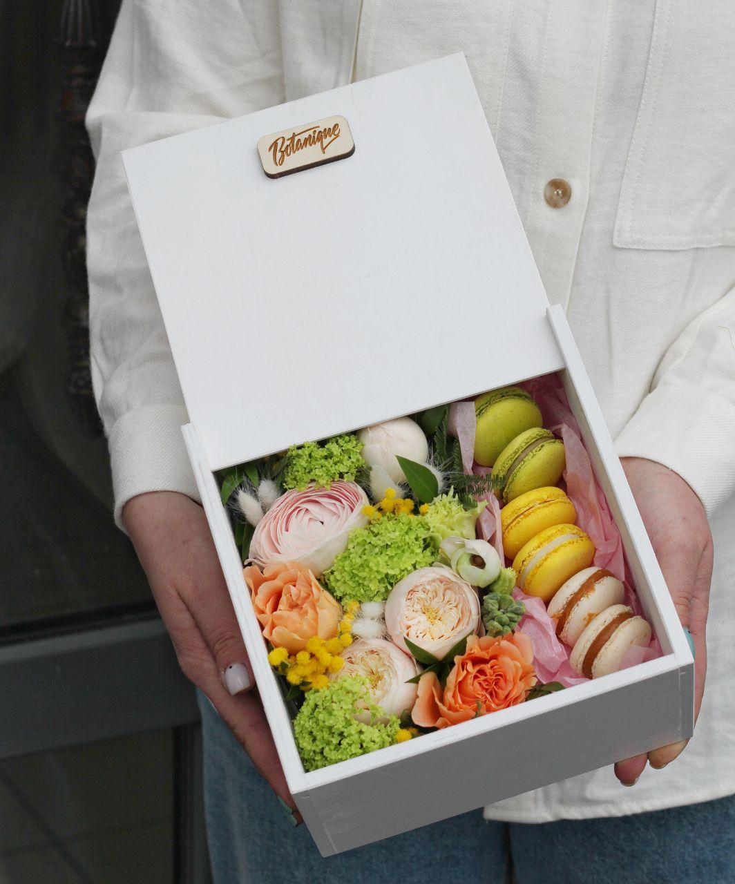 Коробка с цветами и макарунами