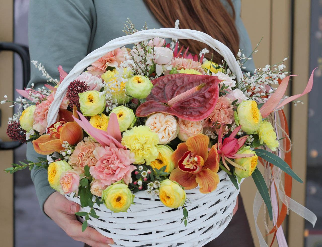 Корзина с пионовидными розами, гвоздиками и орхидеями