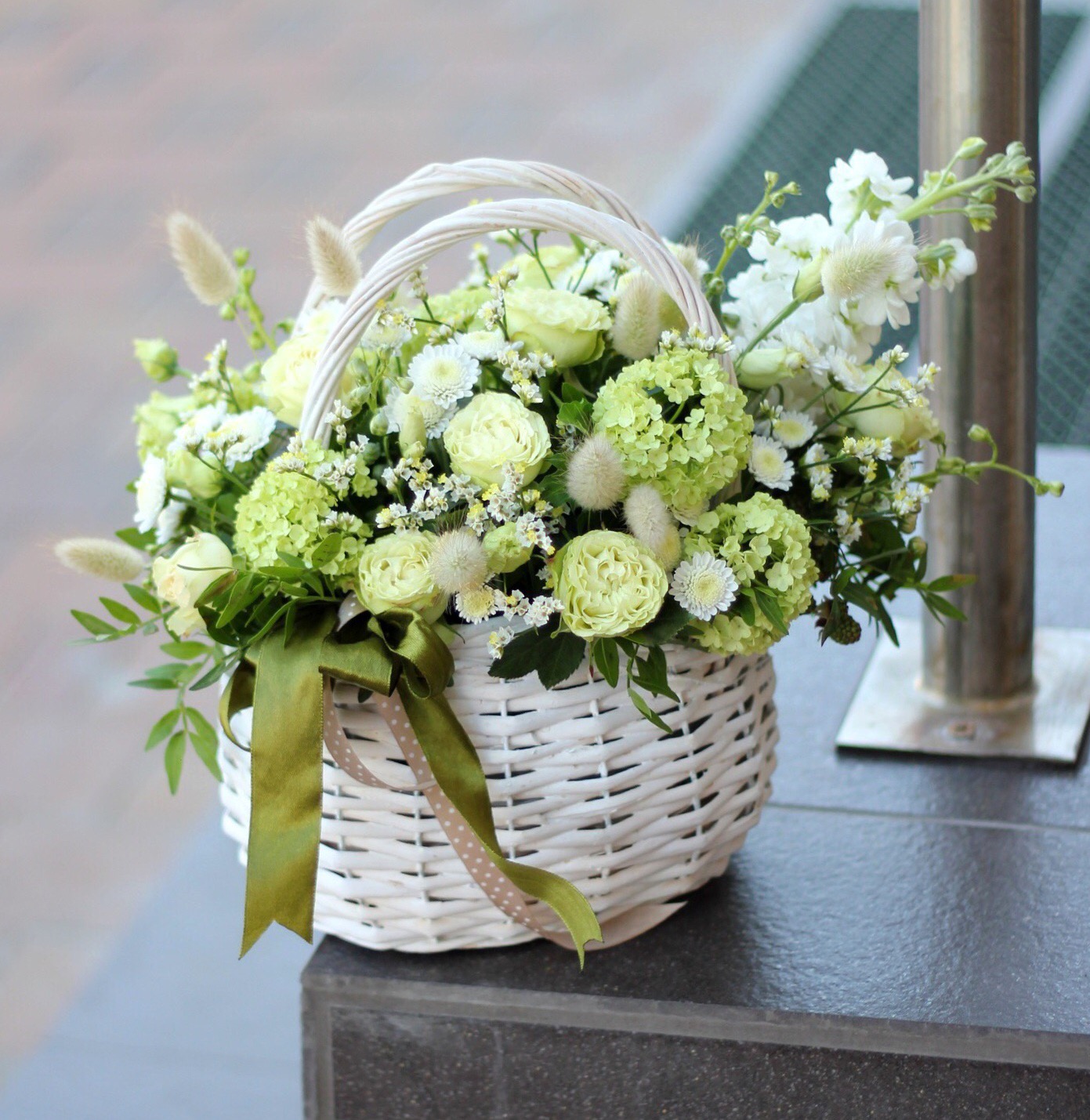 Корзина с кустовыми розами, вибурнумом и маттиолой