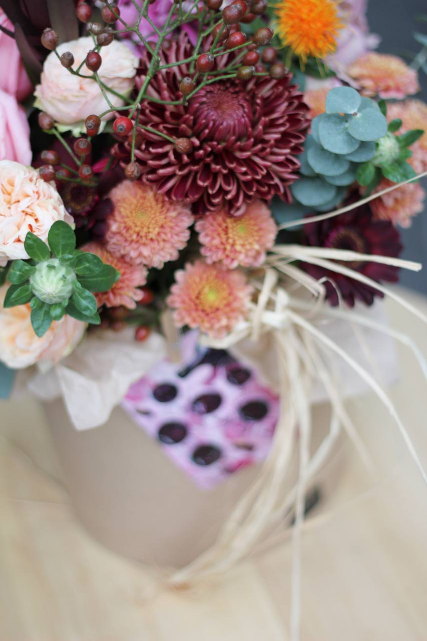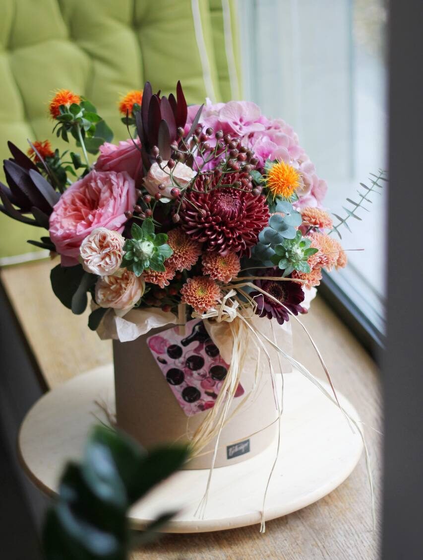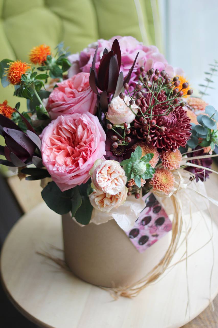 Осеняя композиция в коробке с пиноновидными розами, хризантемами и гортензией