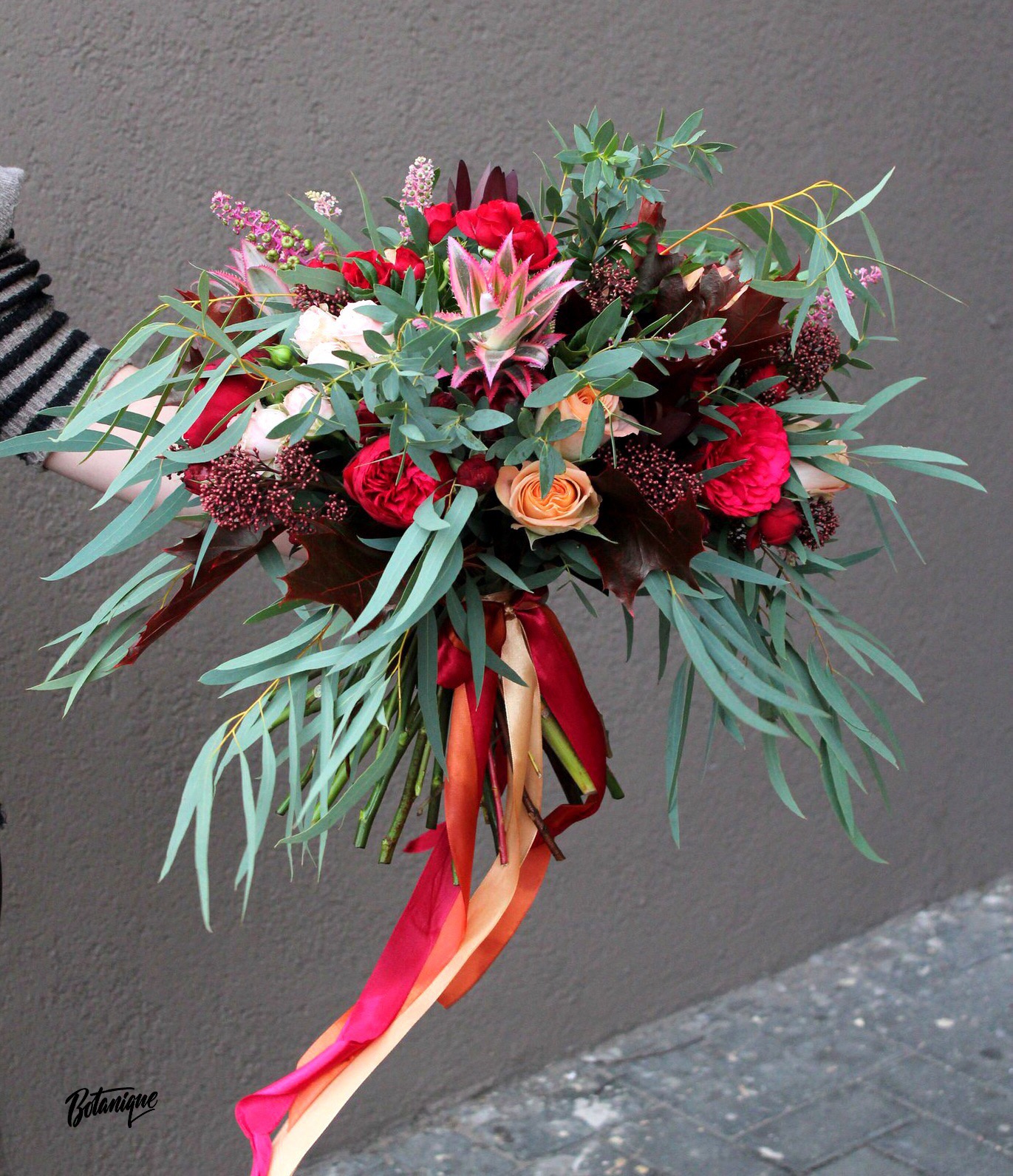 Свадебный букет с пионовидными розами, ананасами, скимией и несколькими сортами эвкалипта