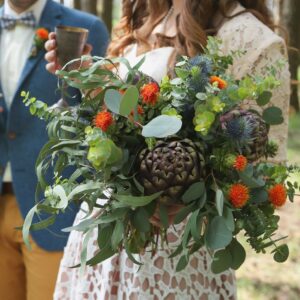Свадебный букет с пионовидными розами, ананасами, скимией и несколькими сортами эвкалипта