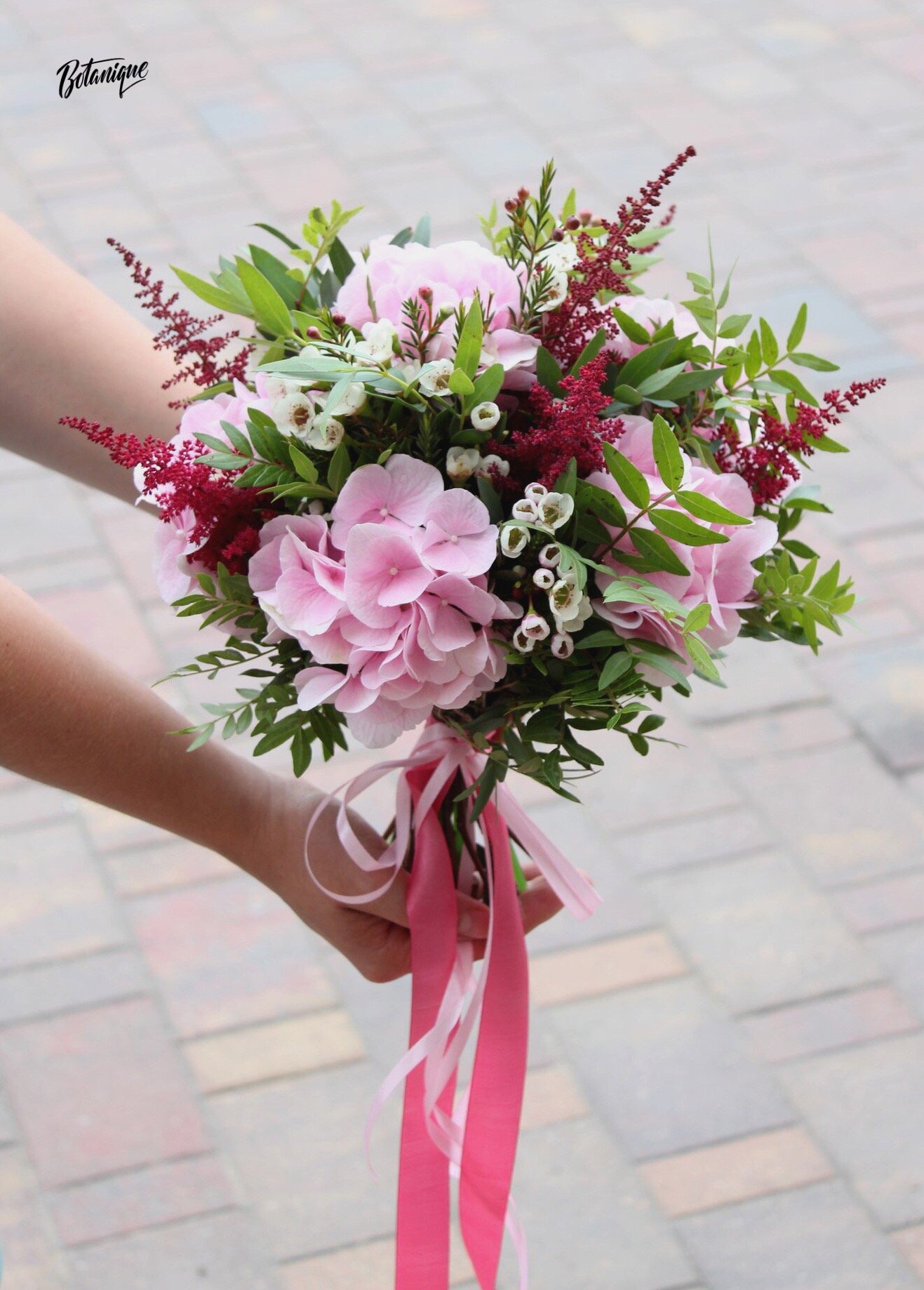 Свадебный букет с гортензией, астильбой, хамелациумом и веточками фисташки