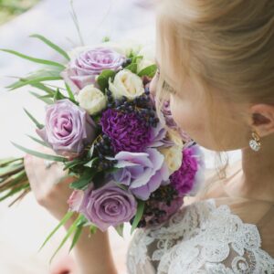 Свадебный букет с гортензией, астильбой, хамелациумом и веточками фисташки