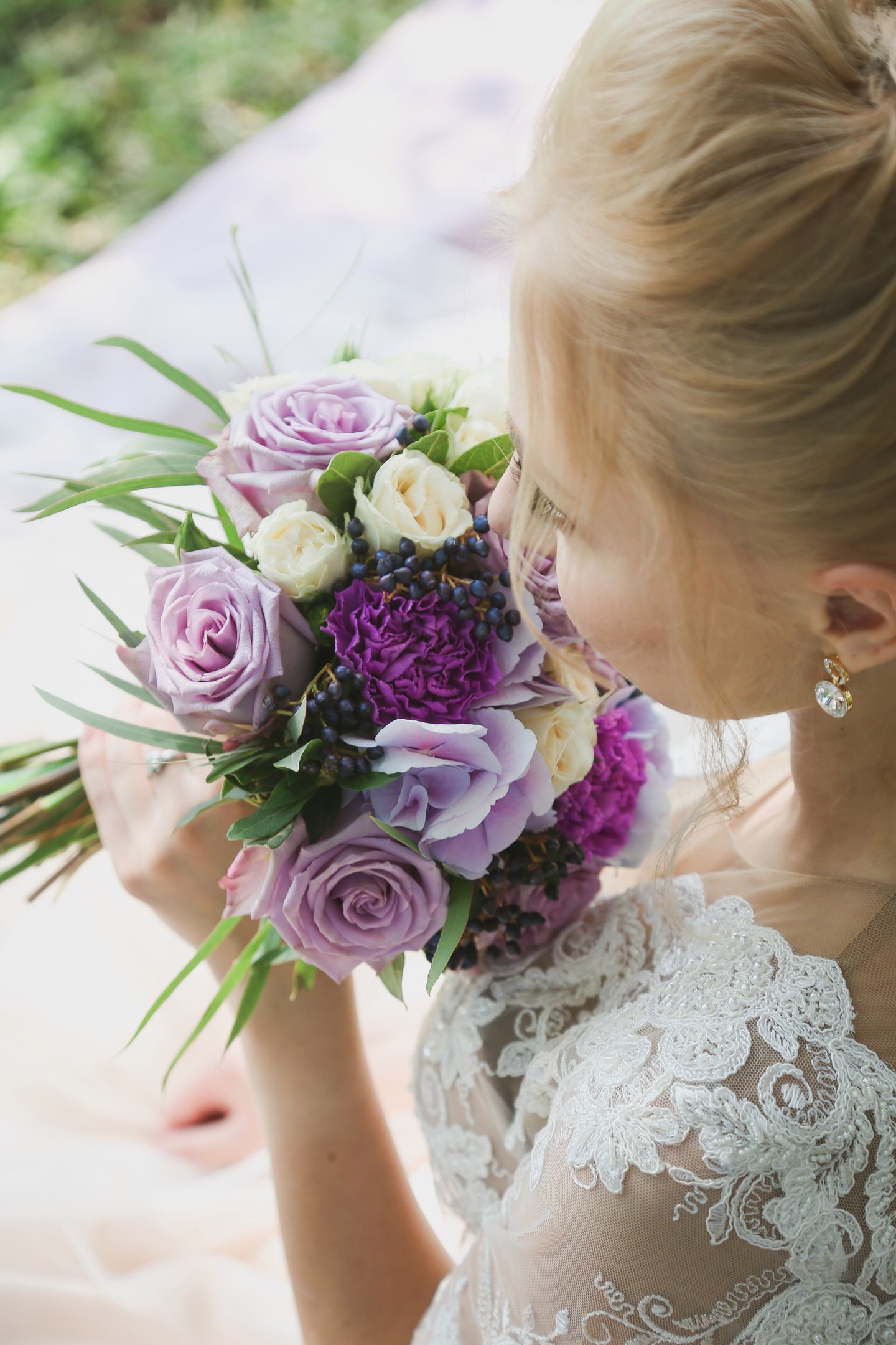 Свадебный букет с сиреневыми розами, гортензиями, ягодами вибурнума и гвоздиками