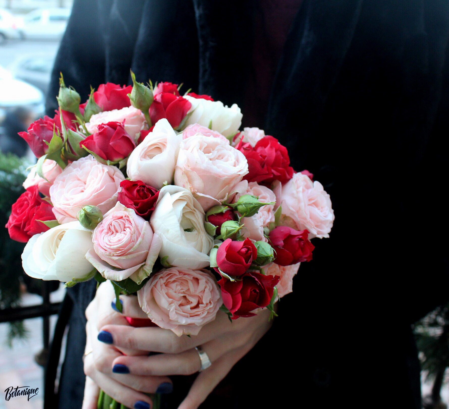 Свадебный букет с ранункулюсами, пионовидными и кустовыми розами