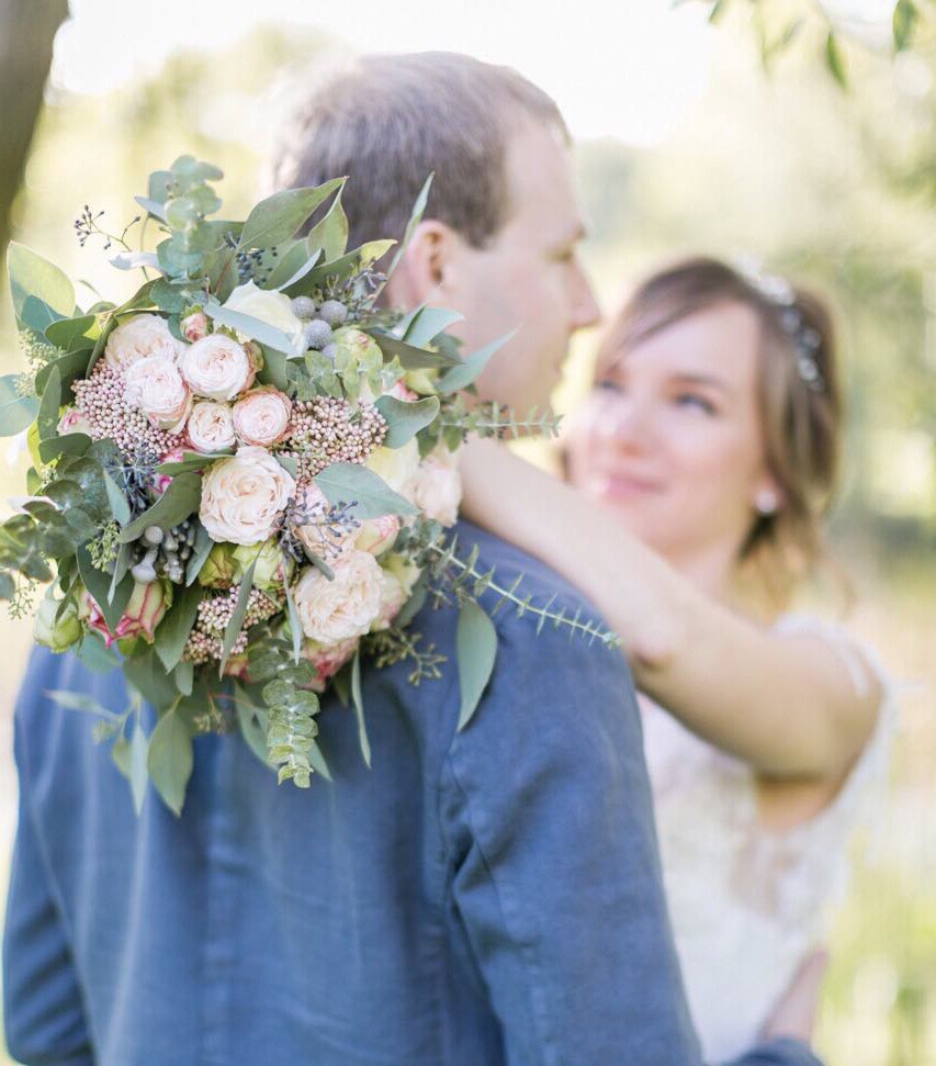 Свадебный букет с пионовидными розами, бруниями, озотомнусами и несколькими сортами зелени