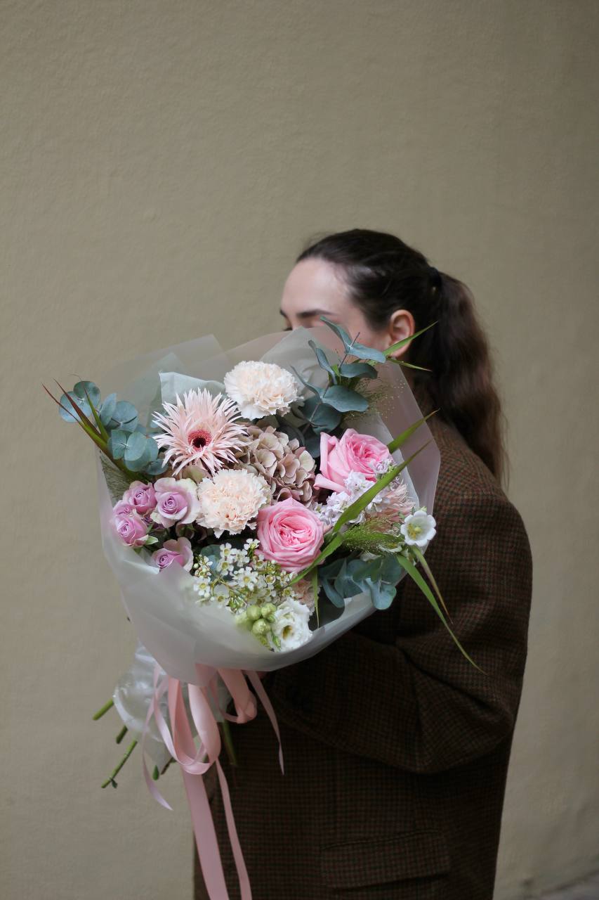 Букет с пионовидными розами, гортензией и добавками